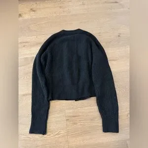 Universal Thread ribbed knit cardigan in black. Full button-front closure with round neckline. Long sleeves and a slightly cropped hem. Simple, versatile layering piece.