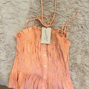 Chic peach top with sleeveless design. Features button-down front and delicate ruffles.