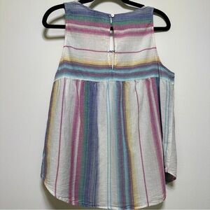 Striped linen tank, Sleeveless summer top, Lightweight linen blend, Universal Thread top, Pastel stripe blouse, Casual warm weather top, High-low hem tank, Easy summer layering, Resort wear top, Coastal casual style, Breathable everyday top, Sunset stripe tank, rainbow stripe tank, colorful casual top, beach day outfit, scoop neck tank, boho casual.