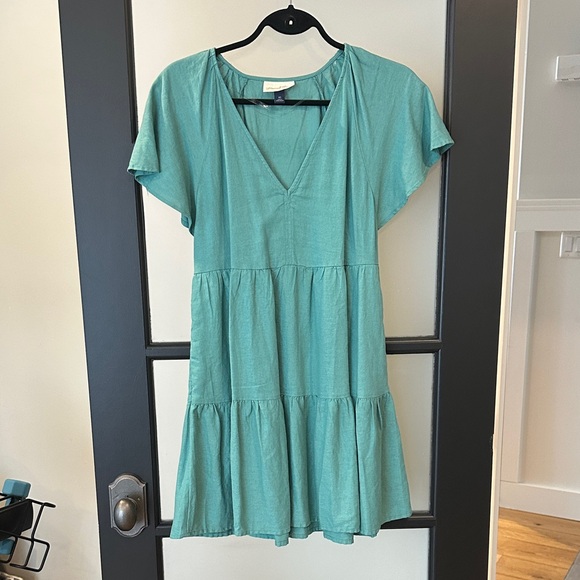 Chic mini dress with a V-neckline. Short sleeves and tiered design. Perfect for casual outings.