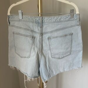 Trendy light wash jean shorts. Frayed hem adds style. Perfect for everyday wear.