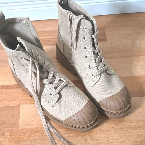 Step out in style with these chic beige canvas ankle boots. Perfect for casual outings, these boots offer both comfort and durability. Elevate your wardrobe with this versatile footwear choice.