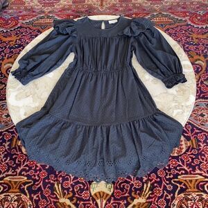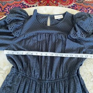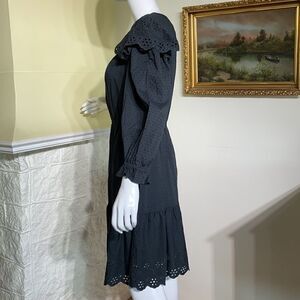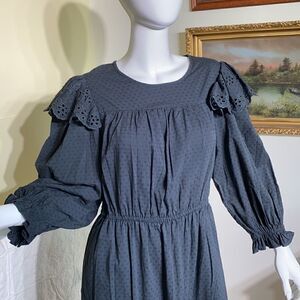 New without tags lovely 1970’s Little House in the Prairie inspired boho dress, dark grey cotton / rayon blend eyelet fabric, ruffles at shoulder and hemline, elasticized waist, 3/4 length puffy sleeves, hidden side pockets. A lovely and versatile piece.
