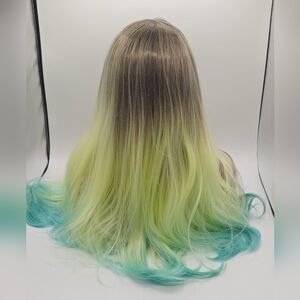 Gorgeous & fun colourful ombre blend of rooted ash blonde that turns into a lime & teal at the ends. 13.3x3 lace parting space. Approximately 26" long.