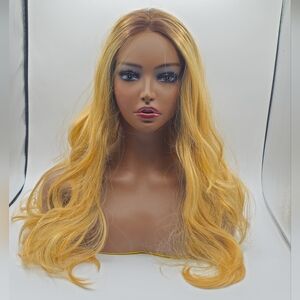 Sandy golden blonde wavy lace front with soft layers in front. 13.3x3 parting space. Close wefted cap with combs & adjustable hooks for a secure fit. Approximately 26" long.