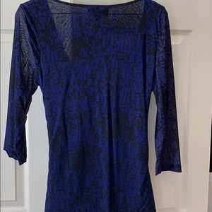 Sheer rich blue n black fabric, lined, sleeves 3/4s, boho style and elegant. Ver gently used. Size M but fits like S