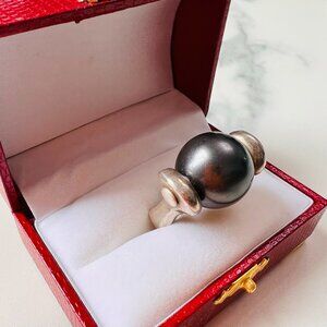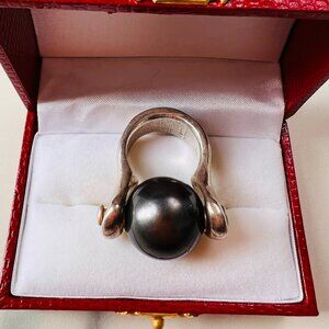 In other words, each piece is special and crafted with care. The large pearl centre swivels and is held in place by architectural 'industrial vibe' bolts on either side of the pearl. This is a substantial and heavy piece, ring size approximately 7. Note that there is a small scratch on the pearl visible in the last photo. It does not detract from the ring at all, and because the pearl can turn, it is not visible when worn.