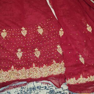 Unstitched red bridal lehenga with handcrafted dabka and pearl embroidery.