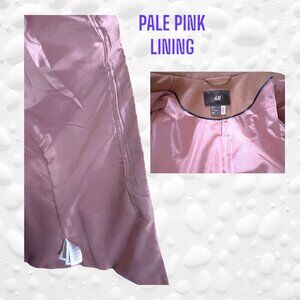 Small top pocket, two side pockets, fully lined with a pale pink lining, small pleat in the back
