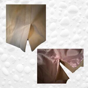 Small top pocket, two side pockets, fully lined with a pale pink lining, small pleat in the back