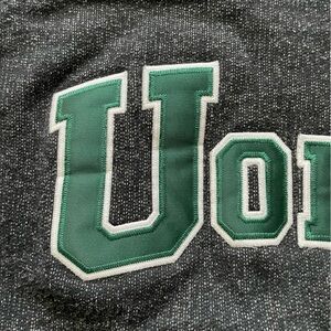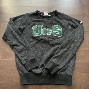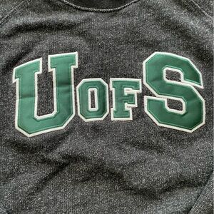 UofS (University of Saskatchewan) crewneck sweatshirt with green varsity letters across the chest. Designed to keep you warm while showing school spirit.