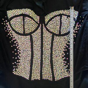 I got this corset off of SHEIN, it's just a basic piece of lingerie. However, when I apply the glue and rhinestones to it, which are glass AB rhinestones, it firms up the garment creating some shape and form. It's a beautiful piece and it takes hours to apply the rhinestones and ensure that they stay on. I used E6000 glue. I recommend washing this by hand and laying flat to dry. Comes from a pet friendly home.