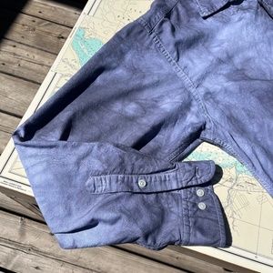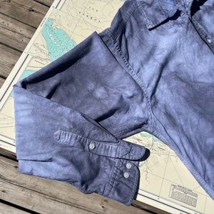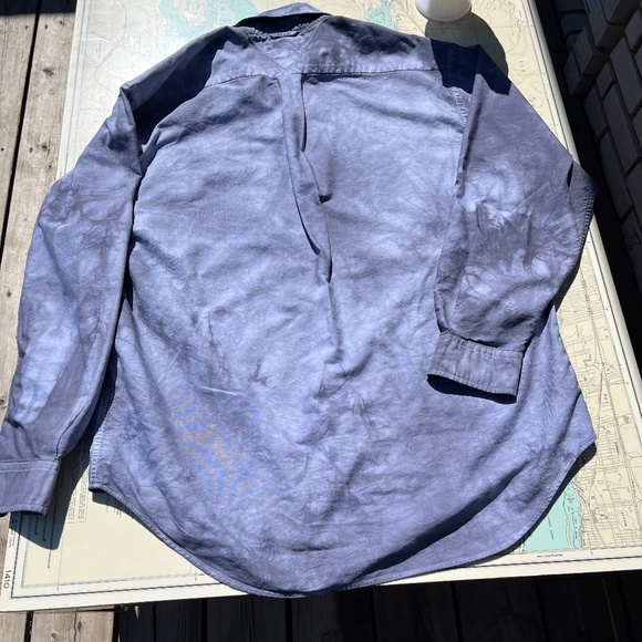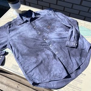 Rough dyed blue grey Tommy Hilfiger button up shirt. When I came across this piece it was a mess - full of stains. The fabric was still nice, so I grabbed it and tried to remove stains. After a few failed attempts, it was added to my dye pile. I'm so happy it was! Beautiful blooms formed to give it a soft and subtle tie dye look. 100% cotton. Tagged as a size large, measures 22" across shoulders, 25" pit to pit, 29" long front, 34" back.
