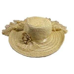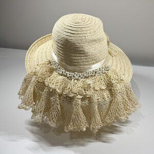 A wide brimmed straw color hat has been upcycled with a vintage doily accents