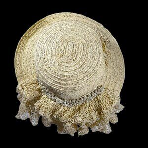A wide brimmed straw color hat has been upcycled with a vintage doily accents