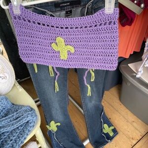 Upcycled bell bottom jeans & hand crocheted tube top. Cacti’s can be removed