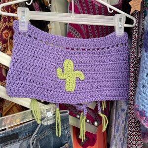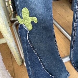Rare to find stretch Jordache jeans created into bell bottoms with frayed edges. Jeans fit more like a size 6 to 8. Hand crocheted matching tube top. Cacti’s can easily be removed if you wish. Paired with a cowboy hat and your ready for an adventure!