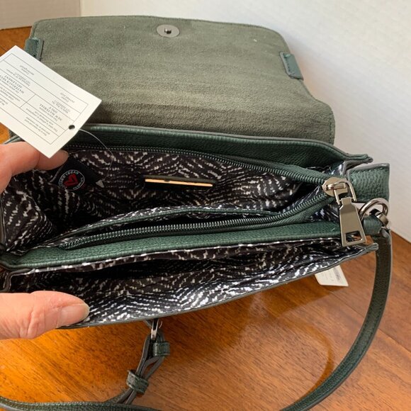 This stylish crossbody from Urban Expressions features a textured vegan leather exterior in a deep forest green. The fringe flap adds a fun, boho-chic vibe, and the interior is fully lined with an eye-catching black and white patterned fabric. The flap closes with a magnetic snap, and the main compartment includes two spacious sections separated by a center zip pocket.