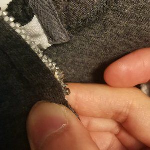Dark Grey Hoodie, Zipper works but is missing the pulling part of the zipper
