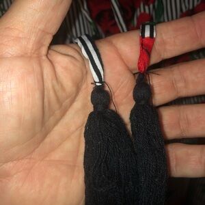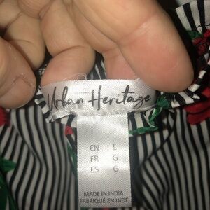 Chic off-shoulder jumpsuit with red floral accents and black stripes. Perfect for a stylish look. Urban Heritage Off-Shoulder Jumpsuit- large with tassels/ wide legs/ peasant top. So cute, dress it up or dress it down depending on where you are going lightly used.