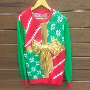 Bright red and green sweater with a bold gold bow. Snowflake pattern adds charm. perfect for your next festive holiday gathering.