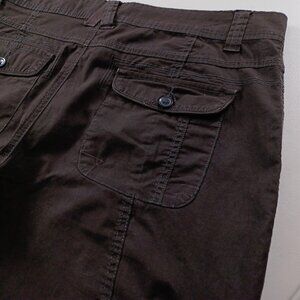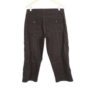 Lightweight cargo capris in a coffee brown shade. They’re a mid-rise fit and made from a cotton blend with a comfortable stretch. They have a zipper and two-button closure, along with belt loops for accessorizing. With six pockets, you'll have plenty of storage for your on-the-go essentials. Plus, they have a roll-up tabs on the leg hems for when you want to cool off by the water. Perfect for summer. Great condition.