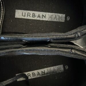 This a pair of Urban Man Brand black boat shoes, size 9 featuring Faux leather uppers with white contrast stitching and lace up design. The shoe appears to be lightly used, with minimal visible wear and no major scuffs or damage, these are a contemporary, mass produced casual footwear option, typically sold at budget retailers