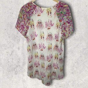 Rare Arts Thread x Urban Outfitters Make It Camille Festival Tunic Dress. Women's size large. This is the art student design winner. Lux silk tee dress from the collective at ARTS THREAD in an exclusive boho-modern print with contrasting short raglan sleeves. Complete with a rounded shirttail hem and a scoopneck in a drapey fit. 100% silk. Hand washable. Very good pre-loved condition. No visible flaws.