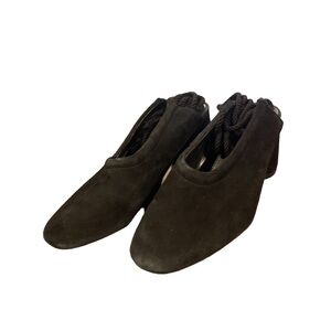 Finished in a soft suede with a scooped vamp, open back + covered block heel.