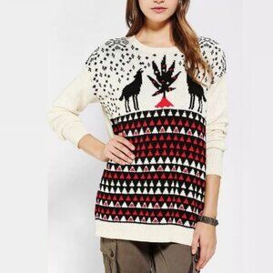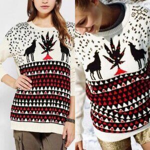 Urban Outfitters Animal Games Pot Leaf Holiday Wolf Howling Sweater in Women's Size Large. By BDG. Rounded neckline with ribbed cuffs and hem. Comfortable and warm oversized knit. 58% cotton, 27% acrylic, 13% nylon and 2% other fibres. Very good pre-loved condition. No visible flaws.