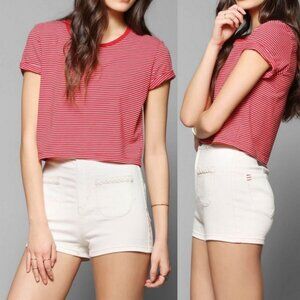 Urban Outfitters BDG Braided Pocket Pinup Shorts in Women's Size 26. Vintage-inspired, high-waisted pin-up shorts from BDG cut in a fitted silhouette with braided detailing along the waist and front pockets. Stretchy-denim construction with angled super-short legs. 78% cotton, 20% poly and 2% spandex. Machine washable. Very good pre-loved condition. No visible flaws.