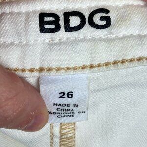 Urban Outfitters BDG Braided Pocket Pinup Shorts in Women's Size 26. Vintage-inspired, high-waisted pin-up shorts from BDG cut in a fitted silhouette with braided detailing along the waist and front pockets. Stretchy-denim construction with angled super-short legs. 78% cotton, 20% poly and 2% spandex. Machine washable. Very good pre-loved condition. No visible flaws.