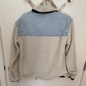Plush Sherpa Jacket with denim panel accents. Zip pocket at the left chest & handwarmer pockets to the sides. Finished with an adjustable drawcord at the hem.