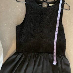 Black minidress originally purchased from Urban Outfitters, but brand name is Kimchi Blue. Top is similar to a loose popcorn elastic, bottom has two layers (one black and gauzy, one solid black) cut in a relaxed skater skirt/circle skirt style.