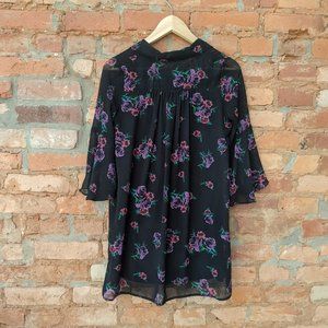 Sheer, black dress with pink, purple and green floral print. Flowy fit with bell sleeves and button-up collar neckline. Comes with attached black slip underneath (see photo #7).