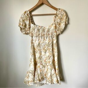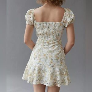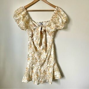 Urban Outfitters En Saison Floral Eyelet Puff Sleeve Tie Front Tiered Mini Dress. White and yellow floral print. Smocked back. Size large. Excellent condition.
