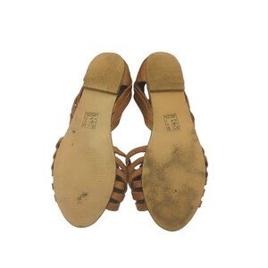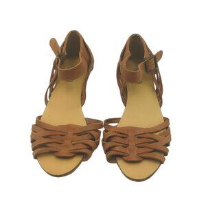 These are brown woven leather ankle strap sandals by Urban Outfitters brand Kimchi Blue.