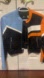Bold leather jacket with striking colorblock design. Features black, blue, and orange panels. Stylish and edgy look.