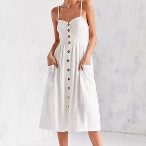 Beautiful midi dress with a fitted bodice and sweetheart neckline. Button-down silhouette with an A-line skirt. Topped with adjustable straps and elastic shirring at the back for the perfect fit.