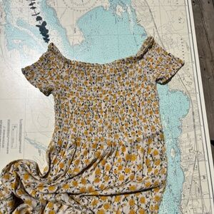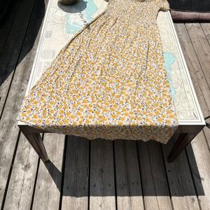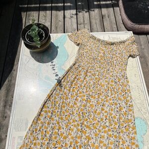 Urban Outfitters marigold pattern Maxi Dress. Capped sleeves with elastic torso and sleeves, full length with faux buttons. Tagged as a size medium, measures 13" across shoulders, 13.5" pit to pit, 13.5" waist, 46" long.