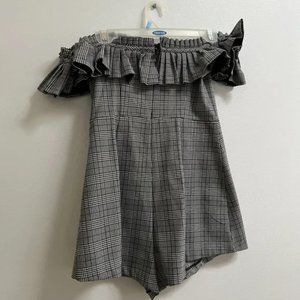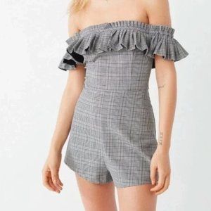 NWOT Urban Outfitters plaid printed romper. Off the shoulder with ruffle detail. Hidden back zip closure.