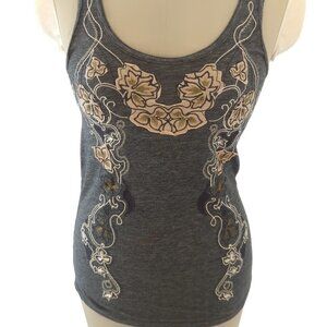 This is heather grey tank top with embroidered flowers by Urban Outfitters brand Pins and Needles.