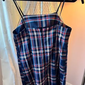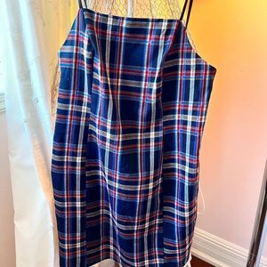 This jumper is in excellent condition. Plaid really pops with its thin small black straps. Dress has a long back zipper.