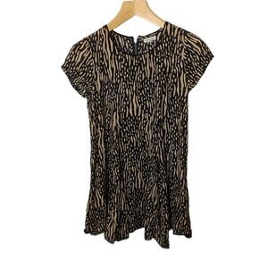 This T-shirt style mini dress by Urban Outfitters brand Silence + Noise is made from a soft and light material in a black and tan abstract print. Cut short and drapey with an angled bottom hem with chiffon trim and pleated princess seams.