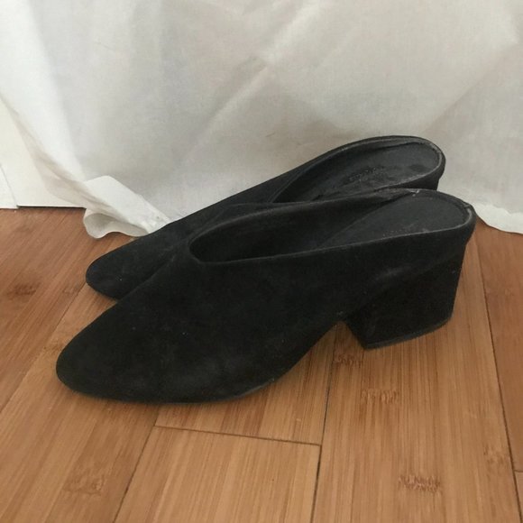 Black suede flare heel mules from Urban Outfitters in good condition. Worn many times and a little dusty, but otherwise good.