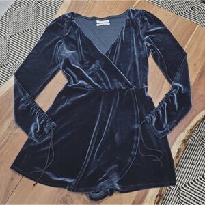 A great evening romper short by Urban Outfitters. Velvet outer, skort style and ruched adjustable sleeves. Surplice top area.