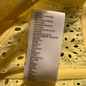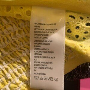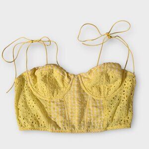Adorable yellow gingham corset crop top with allover floral eyelet embroidery and dainty shoulder ties. Features structured cups, stretch smocking at the back, and a sweet, summery vibe. Lightweight and breathable — perfect for music festivals, beach days, or sunny strolls.