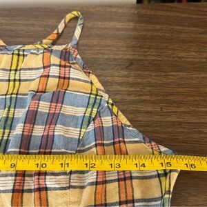 This Urban Outfitters jumpsuit showcases a vibrant blue and yellow plaid pattern, offering a modern and streamlined silhouette. The sleeveless design with a high neckline and tapered ankle-length pants makes it perfect for warm weather wear. Crafted from lightweight fabric, it combines a playful pattern with a practical cut for a casual yet put-together look.