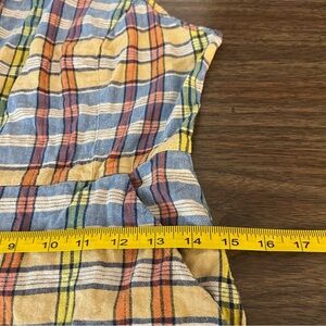 This Urban Outfitters jumpsuit showcases a vibrant blue and yellow plaid pattern, offering a modern and streamlined silhouette. The sleeveless design with a high neckline and tapered ankle-length pants makes it perfect for warm weather wear. Crafted from lightweight fabric, it combines a playful pattern with a practical cut for a casual yet put-together look.