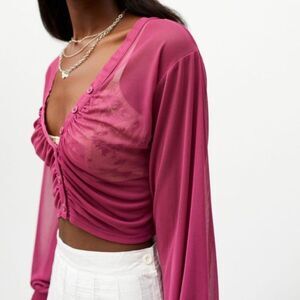 Thin mesh button front top perfect for layering. Deep-v neckline with ruffles on button front. Crop above the waist with oversized sleeves finished with banding cuffs. UO Exclusive.